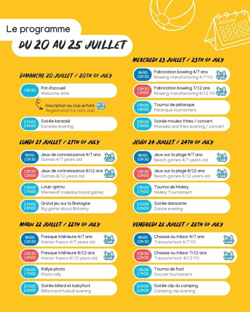 En plus des structures accessibles gratuitement au sein du camping, nous vous proposons un programme d’animations durant l’été, du 5 juillet au 28 août. Le programme sera présenté sur notre page Facebook et Instagram.